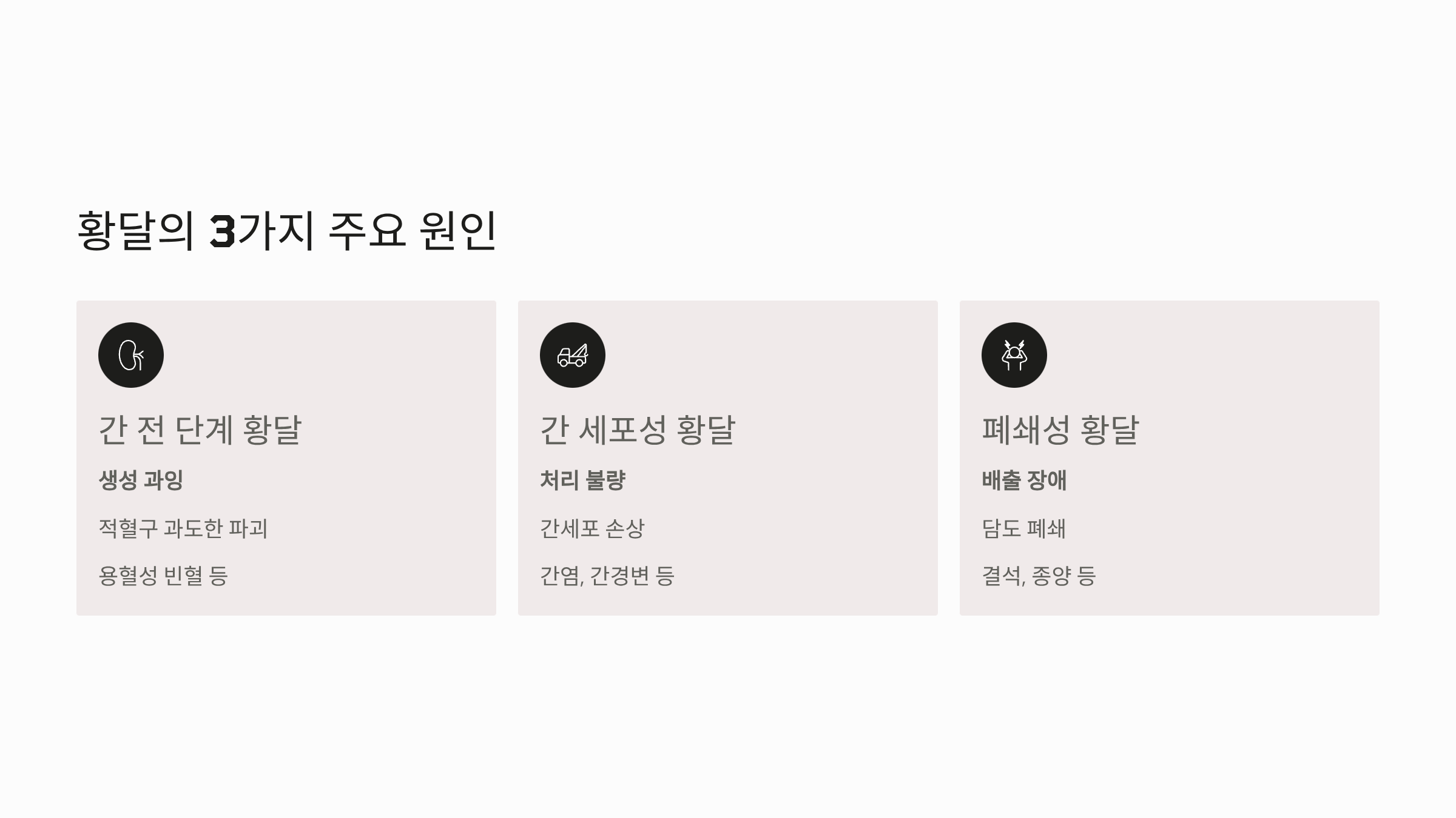 황달은 혈액 속 빌리루빈 농도가 높아져 발생하며, 빌리루빈이 생성되고 배출되는 3단계 과정 중 어디에 문제가 생겼는지에 따라 원인이 구분됩니다.