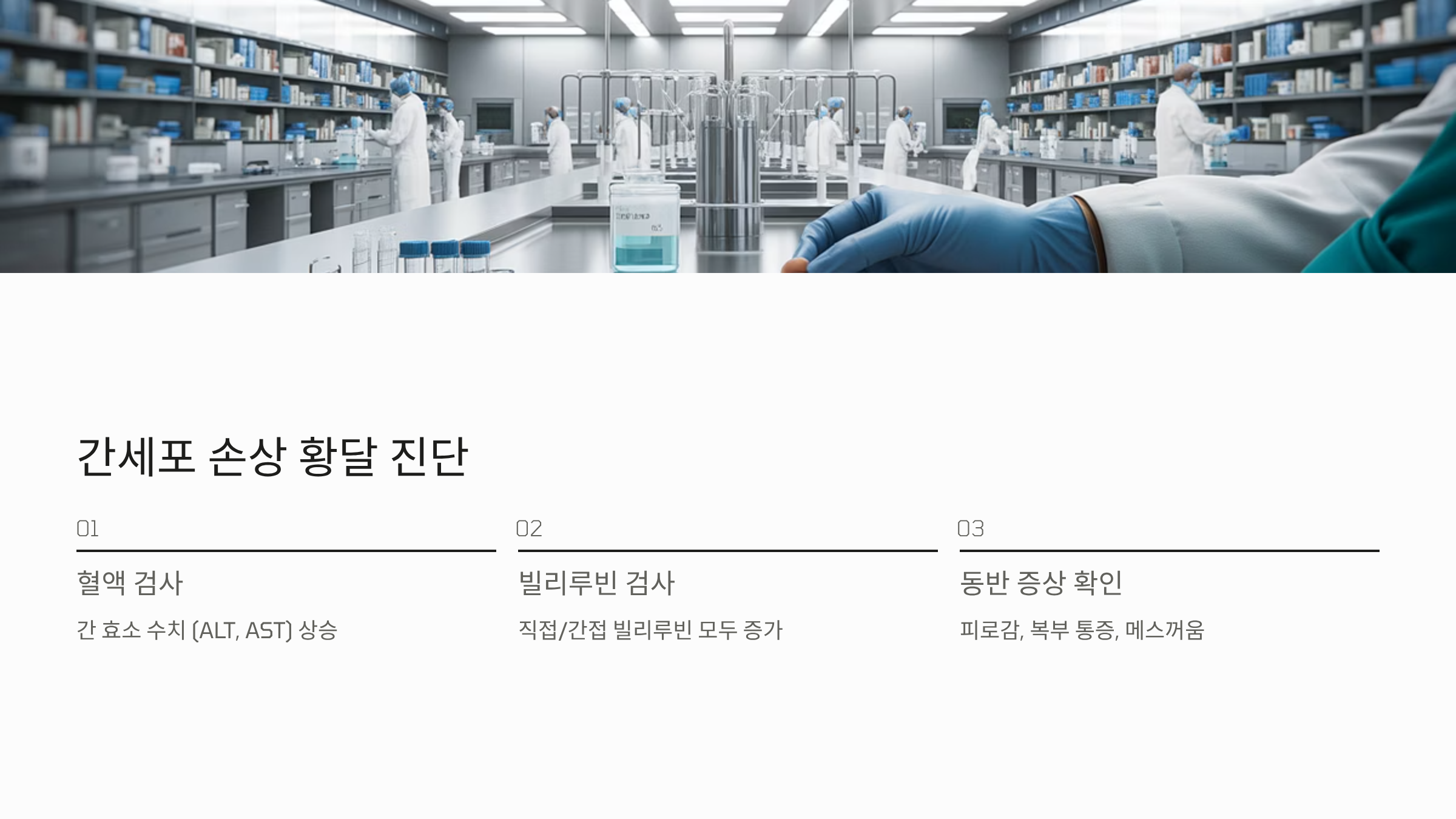 - 진단 기준: 혈액 검사 시 간 효소 수치(ALT, AST)가 정상보다 높게 나타나고, 빌리루빈 중 '직접 빌리루빈'과 '간접 빌리루빈' 수치가 모두 증가하는 양상을 보입니다.