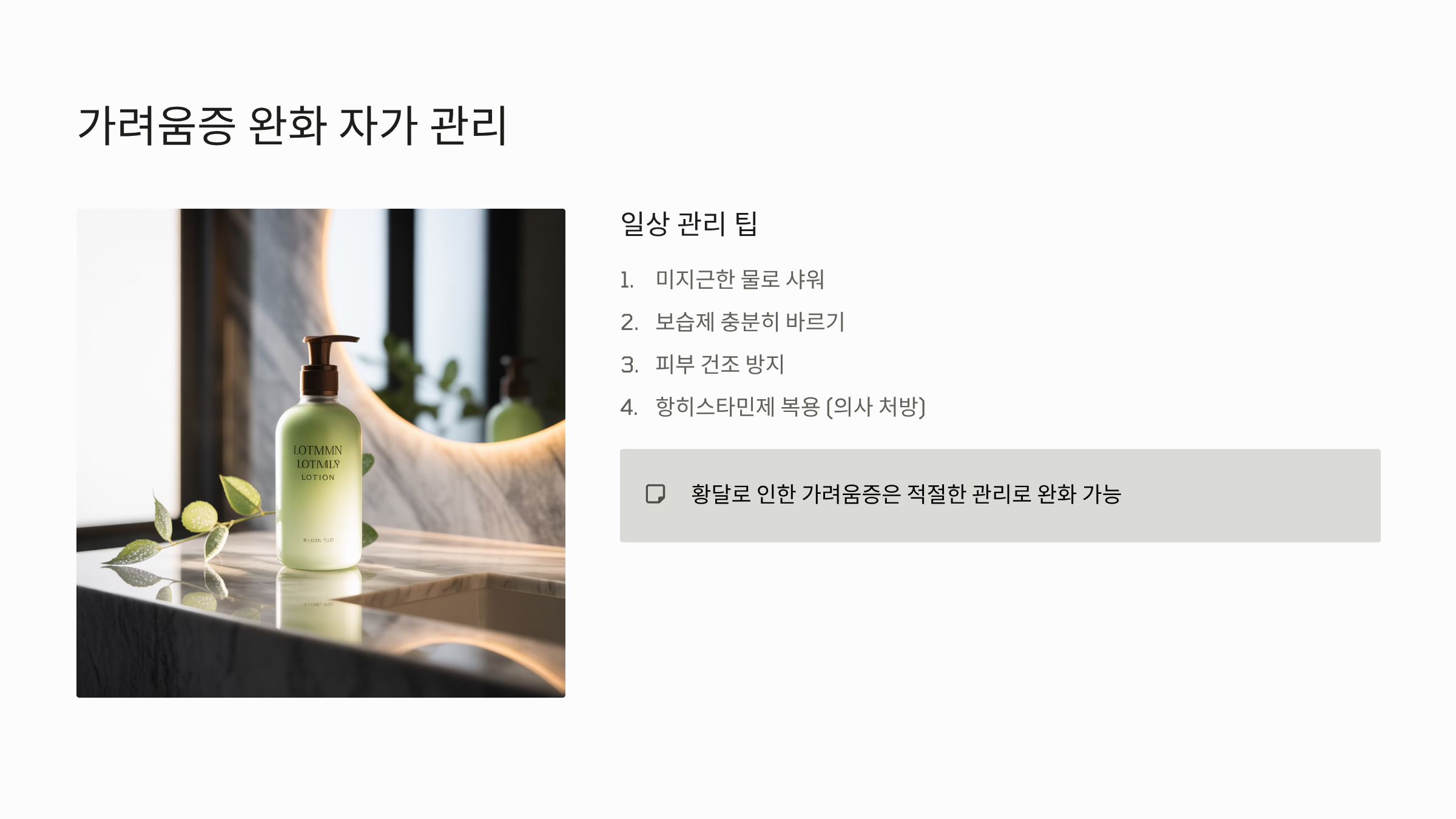 - 가려움증 완화 (자가 관리): 황달로 인한 가려움증이 심할 경우, 미지근한 물로 샤워하고 보습제를 충분히 발라 피부를 건조하지 않게 유지해야 합니다. 전문의의 처방에 따라 항히스타민제 등을 복용하여 가려움을 완화할 수 있습니다.