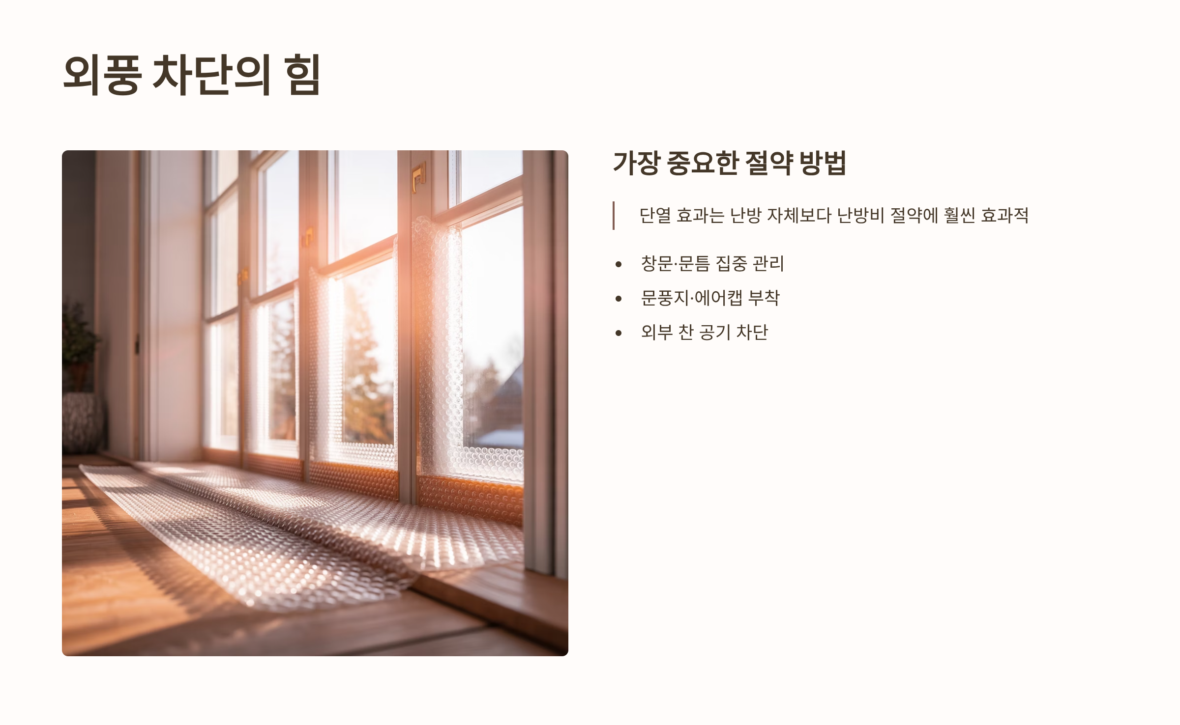 - 외풍 차단 (가장 중요): 창문, 문틈 등 외풍이 들어오는 곳에 문풍지, 뽁뽁이(에어캡) 등을 부착하여 외부 찬 공기 유입을 90% 이상 차단해야 합니다. 단열 효과는 난방 자체보다 난방비를 절약하는 데 훨씬 효과적입니다.