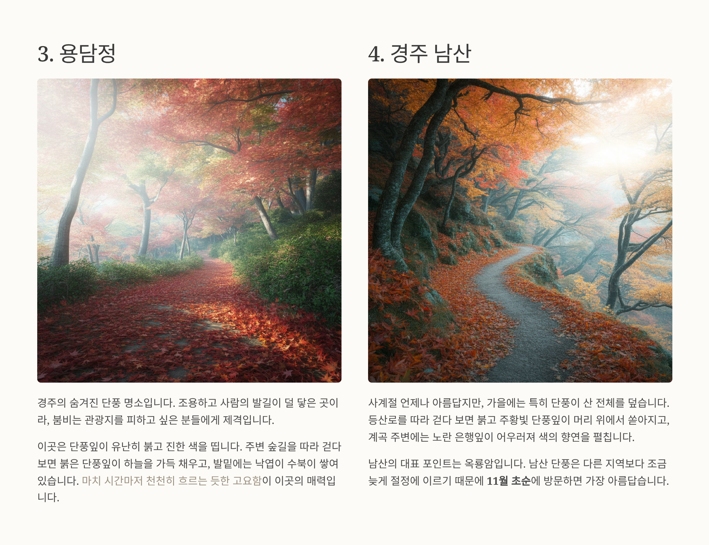 특히 경주는 한 도시 안에 사찰, 숲길, 유적지, 호수, 그리고 감성 거리인 황리단길까지 함께 있어 당일치기 여행이나 1박 2일 여행으로도 완벽합니다. 단풍과 유적, 그리고 맛있는 음식이 함께 있는 도시, 바로 지금 떠나야 하는 이유가 여기에 있습니다.