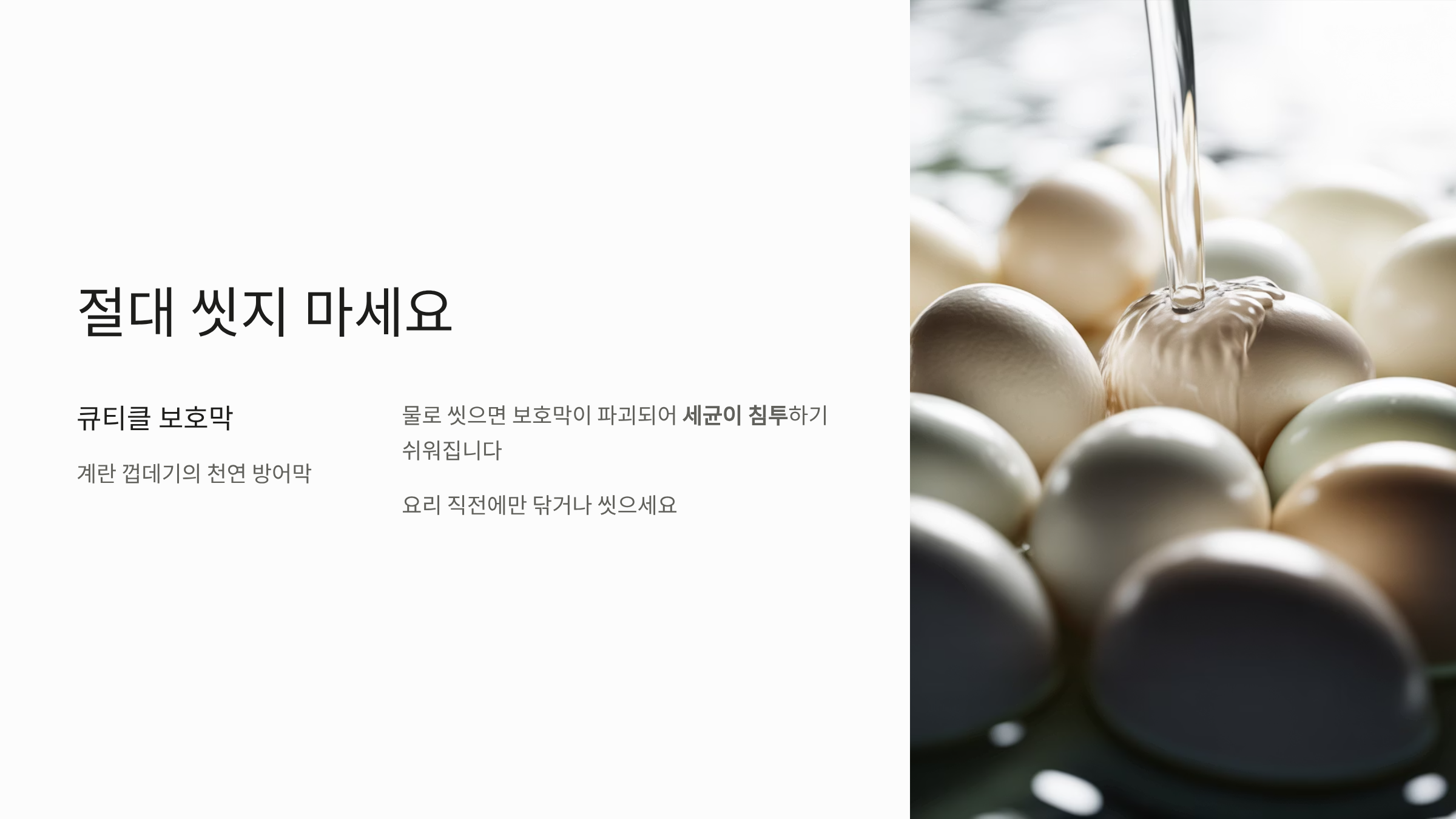 - 씻지 않고 보관: 계란 껍데기에는 미생물의 침입을 막는 보호막(큐티클)이 있습니다. 물로 씻으면 이 막이 파괴되어 세균이 침투하기 쉬워지므로, 절대 씻지 않고 보관하며 요리 직전에 씻거나 닦는 것이 좋습니다.