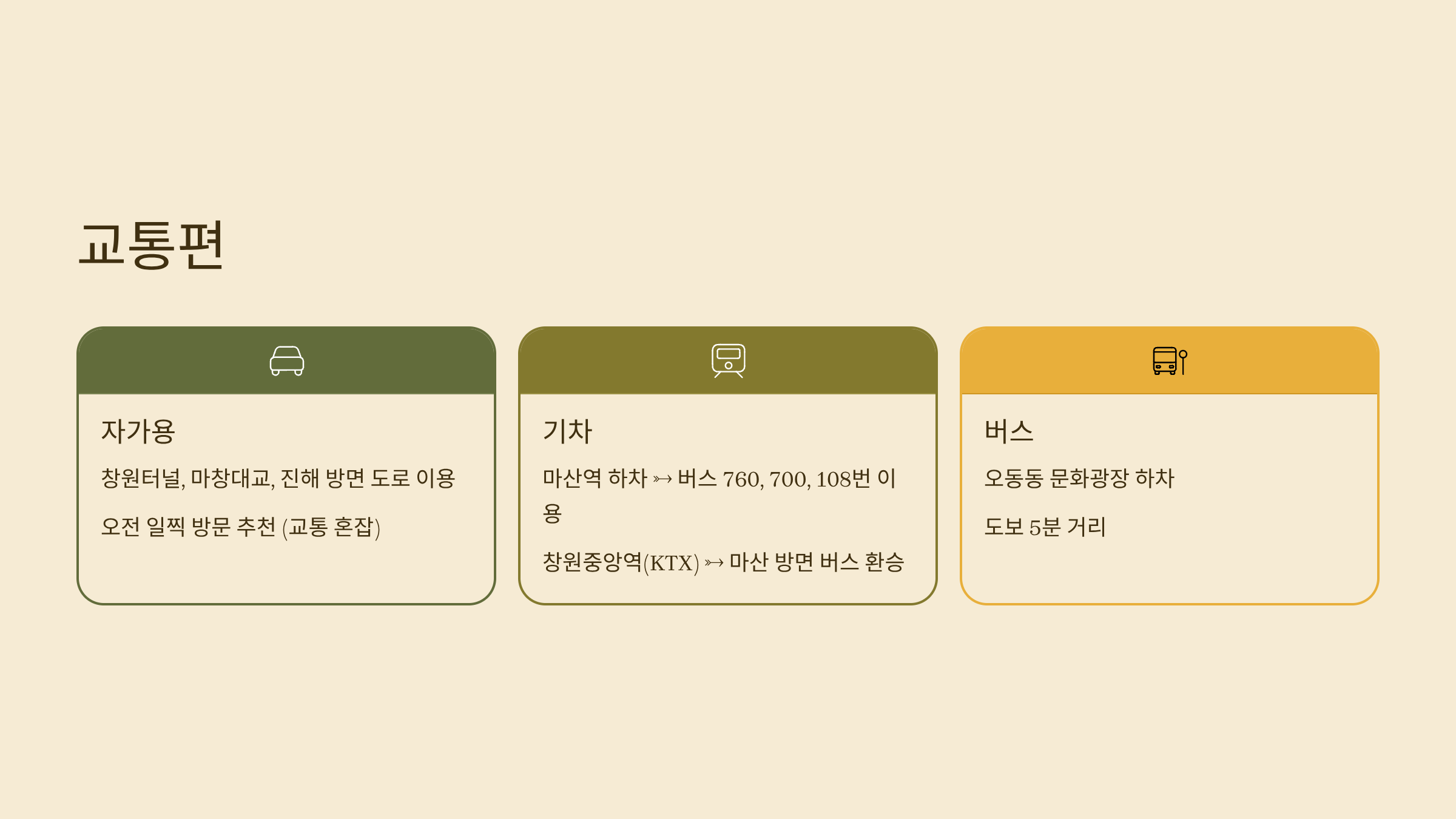 - KTX: 창원중앙역 하차 → 마산 방면 버스로 환승