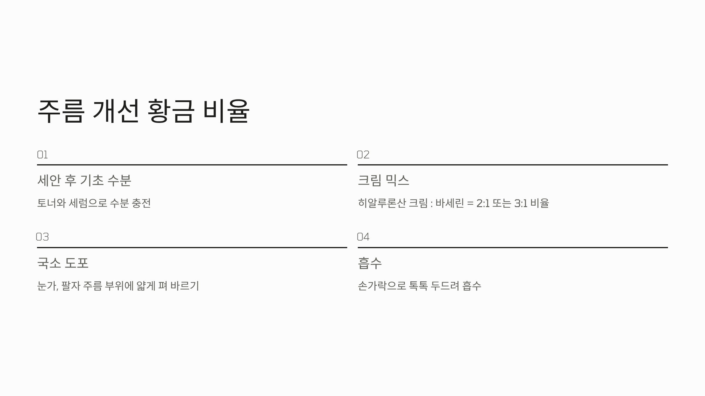 - 도포: 눈가, 팔자 주름 등 주름 부위에만 얇게 펴 바르고, 손가락으로 톡톡 두드려 흡수시킵니다.