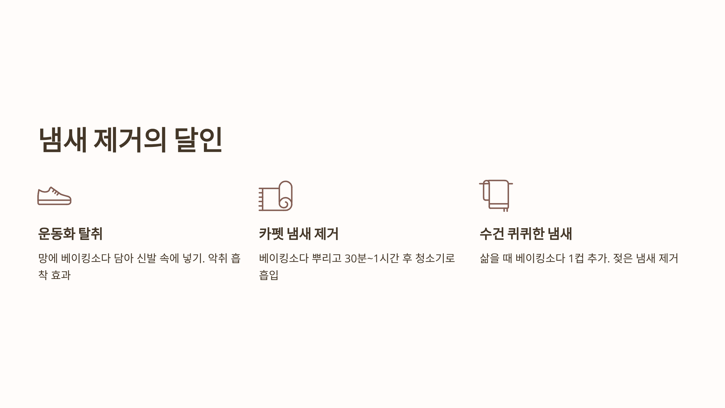 - 수건 냄새 제거: 수건을 삶을 때 베이킹소다를 한 컵 넣거나, 세탁 시 베이킹소다를 추가하면 수건에 박힌 퀴퀴한 냄새(젖은 냄새)를 제거하는 데 효과적입니다.